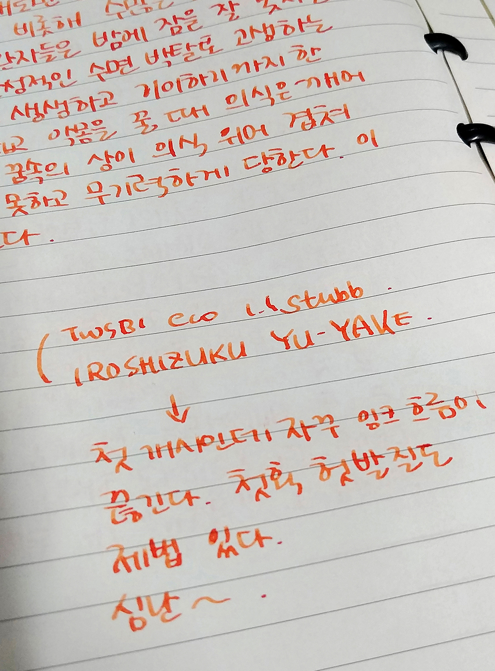 큉크의 흐름도 좋고 닙도 살짤 조절해놔서, 잉크는 꽤 콸콸 나오는 느낌이 있는데도, 헛발질은 나네요.