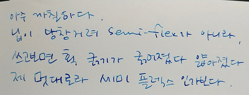 쓰면서는 그냥 다른 스틸닙 펜들로 쓰는 느낌과 비슷했는데, 글자 획 굵기가 들쑥날쑥.