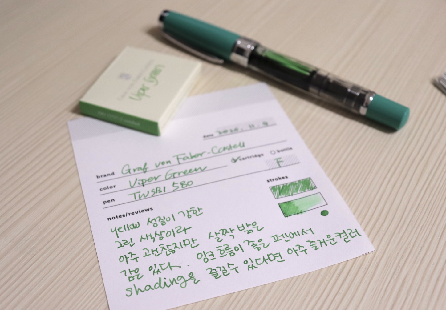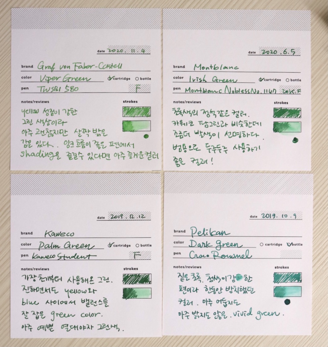 가지고 있는 초록 계열의 잉크들 비교샷.