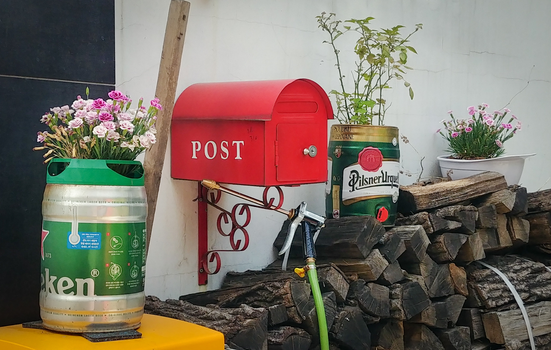 이런 사이즈의 외국 맥주통이 사실 흔한 편도 아니고, 여기에 예쁘게 꽃이 핀 것도 흔하지 않다.