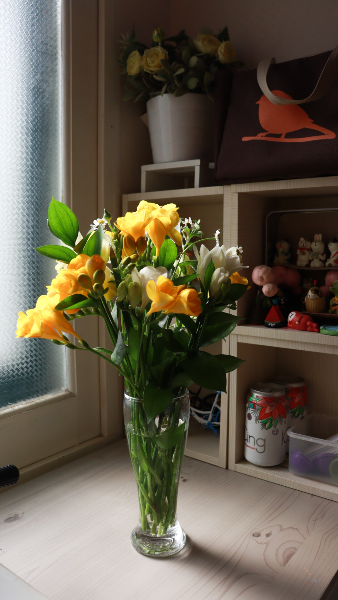 꽃을 받을 일이 없기도 했고 제가 꽃에 그다지 관심이 없기도 했지만, 오래 고양이를 기른 탓에 식물 종류를 들이는 것도 조심스럽긴 합니다. 프리지아도 괜찮을지 잠시 걱정하긴 했습니다. 향이 강하기도 하고 혹시 뜯어 먹기라도 하면 어쩌냐 걱정도 되고...