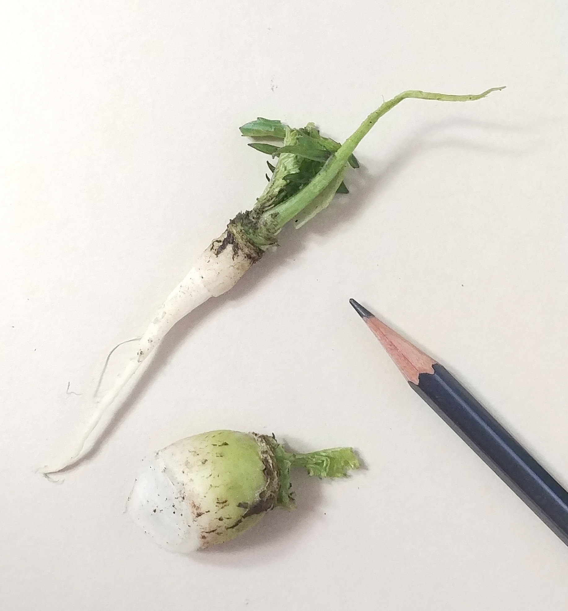 어머니 지인분의 텃밭에서 뽑혀져나온 채 자라지 못한 손가락 한마디짜리 미니 무...쓰지 못하고 결국 버려지긴 했지만이 작은 게 무의 모든 형태를 다 가지고 있다.생명은 아무리 작아도 생명이다.