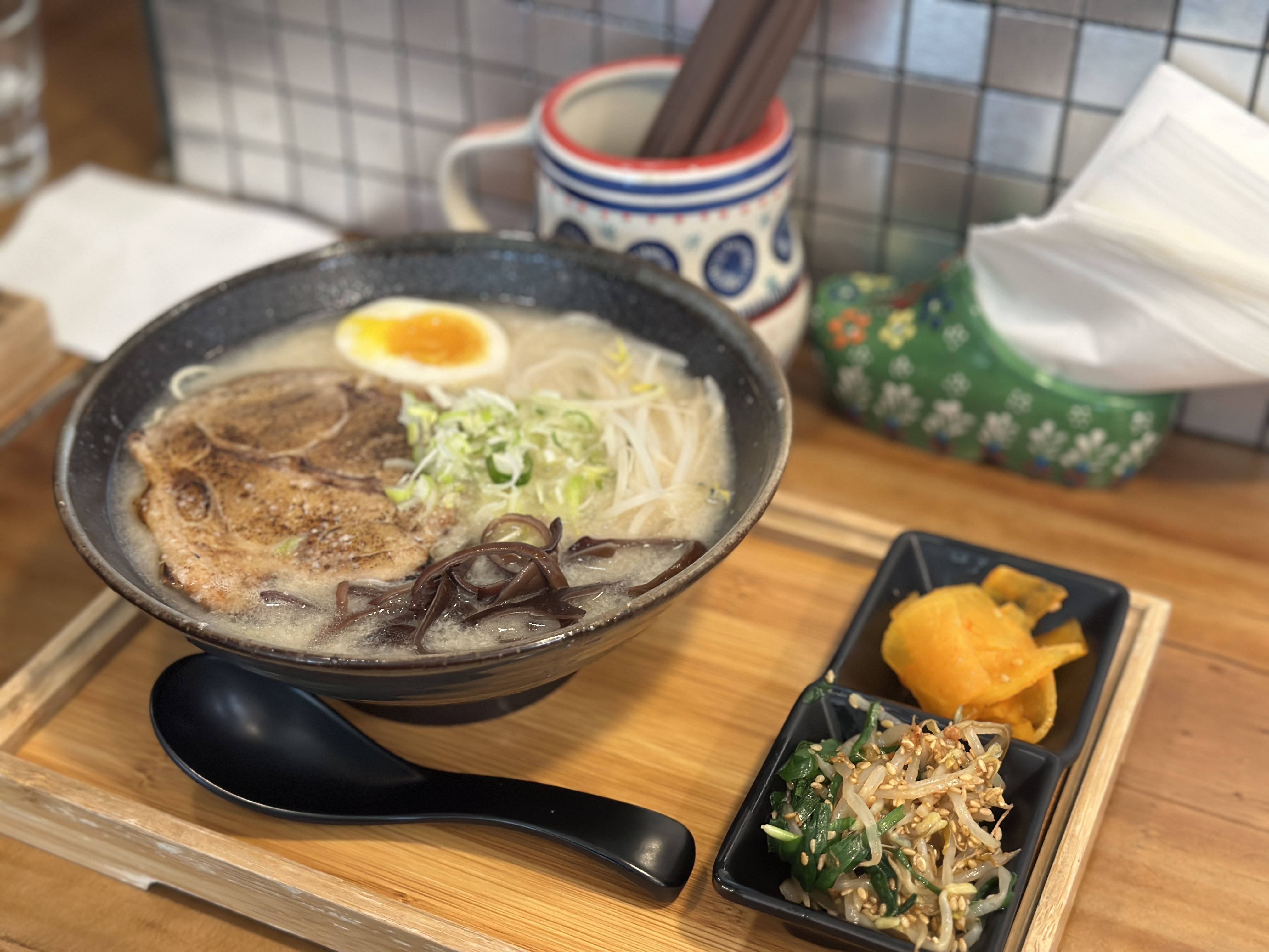 기본 라멘 시켰는데 돈코츠 베이스같긴 한데 ... 좀 다르긴 하더라구요 .